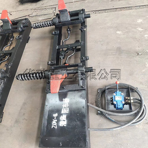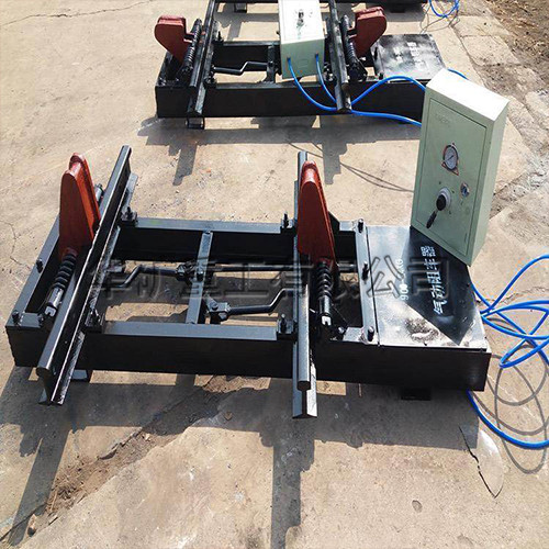 氣動阻車器涉及煤礦井下運輸機械技術(shù)領(lǐng)域,氣動阻車器由兩根平行的固定支座和阻車桿、前支承座、后支承座及腳踏連動裝置組成,單軌阻車器固定支座的兩端分別固定在前支承座和后支承座上,阻車桿置在兩個固定支座之間,連接在兩個固定支座之間的轉(zhuǎn)軸穿過阻車桿的中部,阻車桿呈上端小下端粗重狀,自然狀態(tài)下,其上端翹起,腳踏連動裝置由腳踏板、拉線和撥桿組成,撥桿的中部鉸接于兩個固定支承座之間,其上端通過拉線與腳踏板連接。